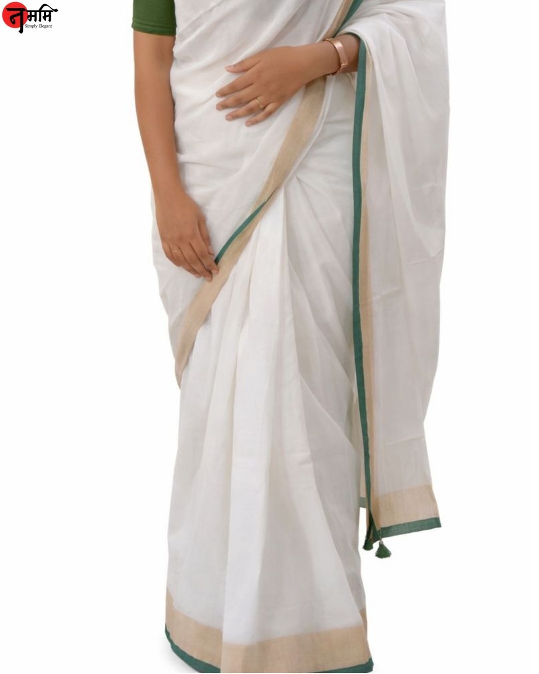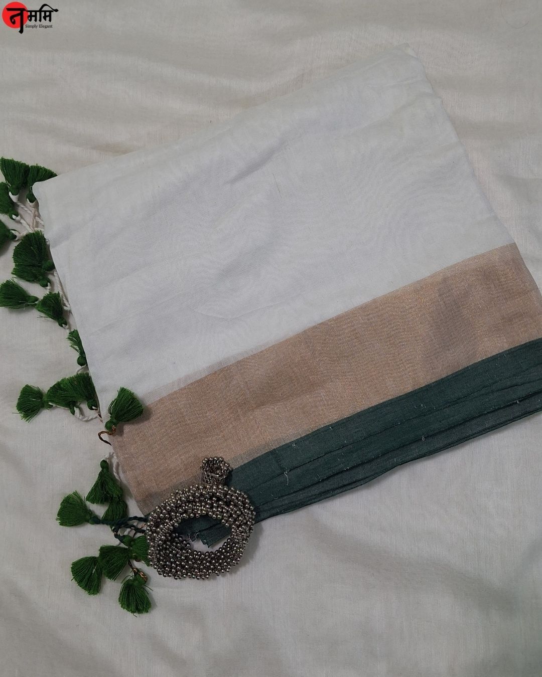 Mulcottn White Saree With Golden – Green Border .